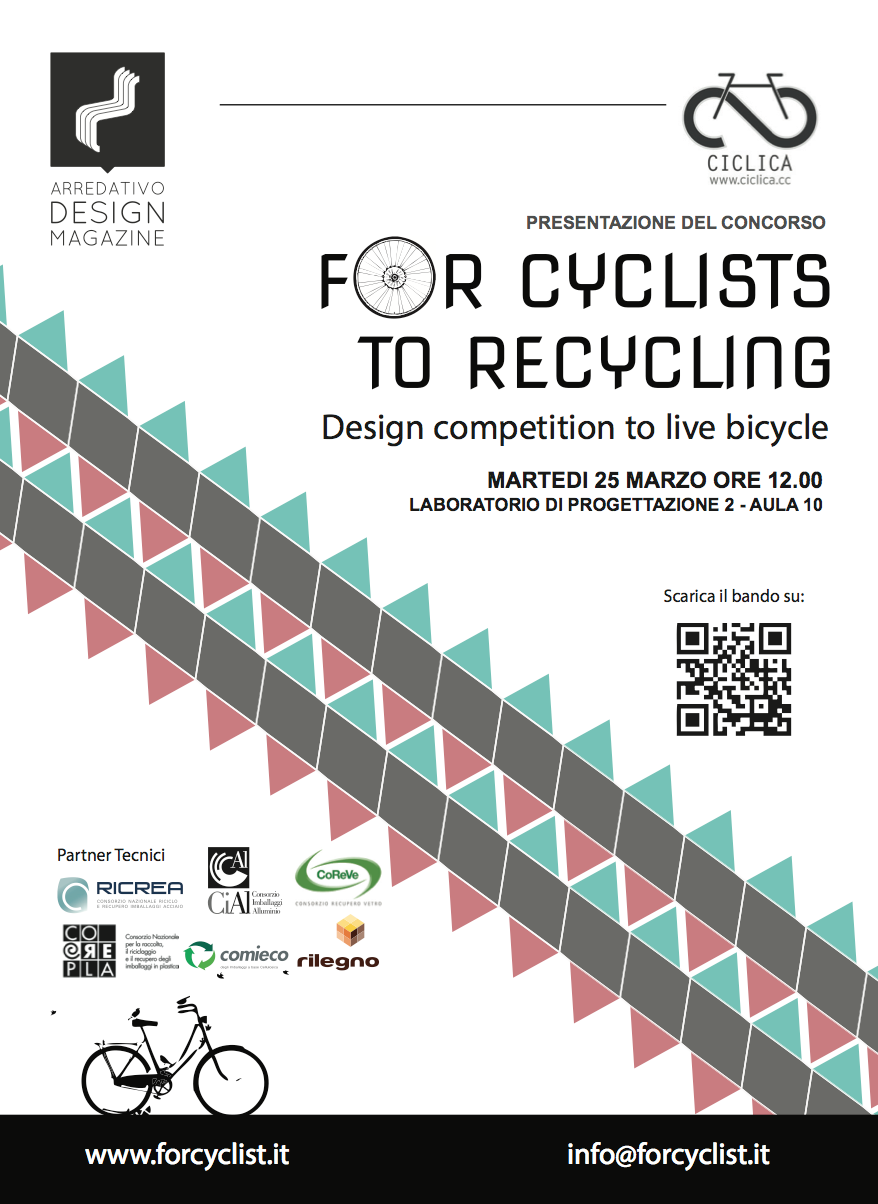 For Cyclist: Concorso Internazionale di design volto a promuovere la creatività e la realizzazione di oggetti pensati per il bikers, ossia volti a migliorare la vita di chi va in bicicletta oppure oggetti ispirati al tema della bicicletta. Prodotti per chi vive la bicicletta a 360° realizzabili utilizzando materiali di recupero o grazie all’utilizzo di materiali riciclati.